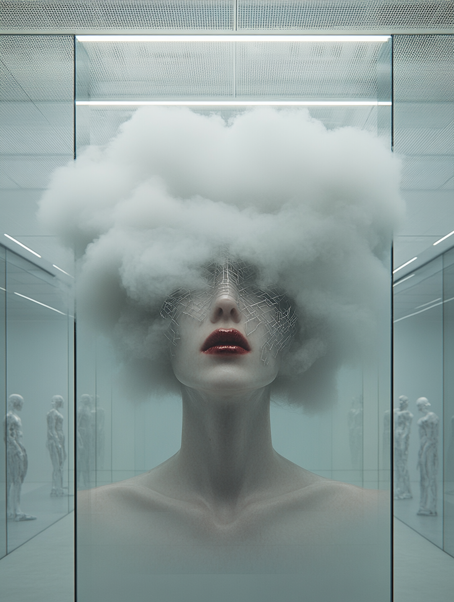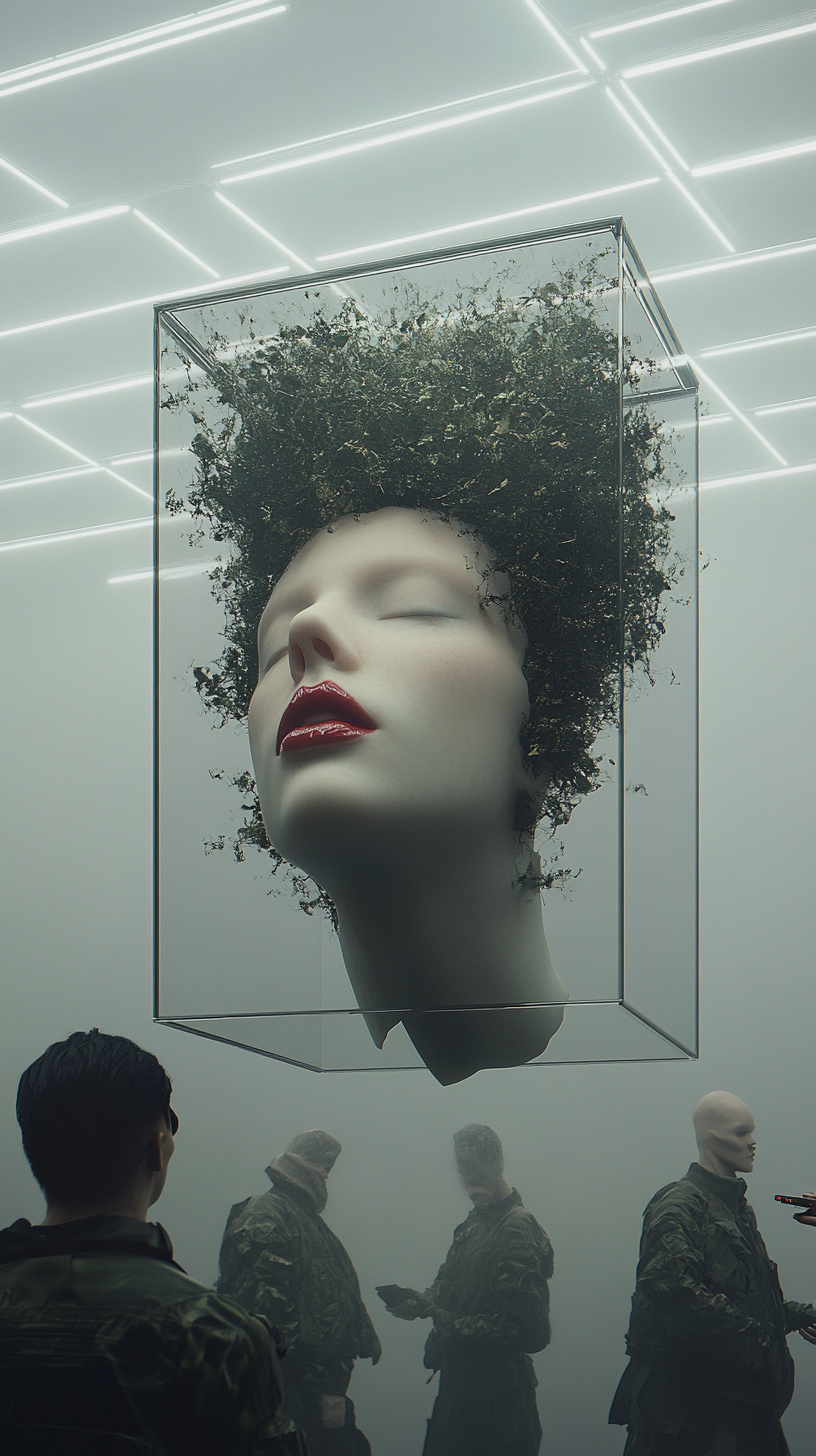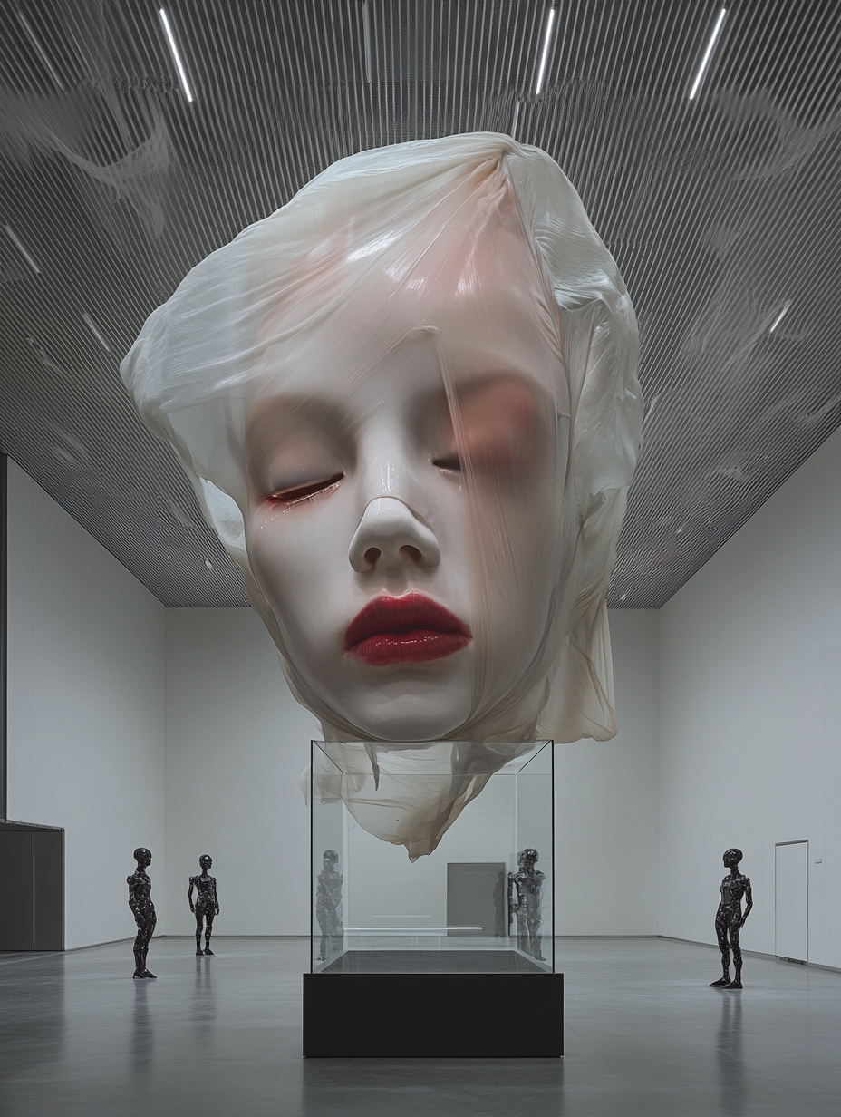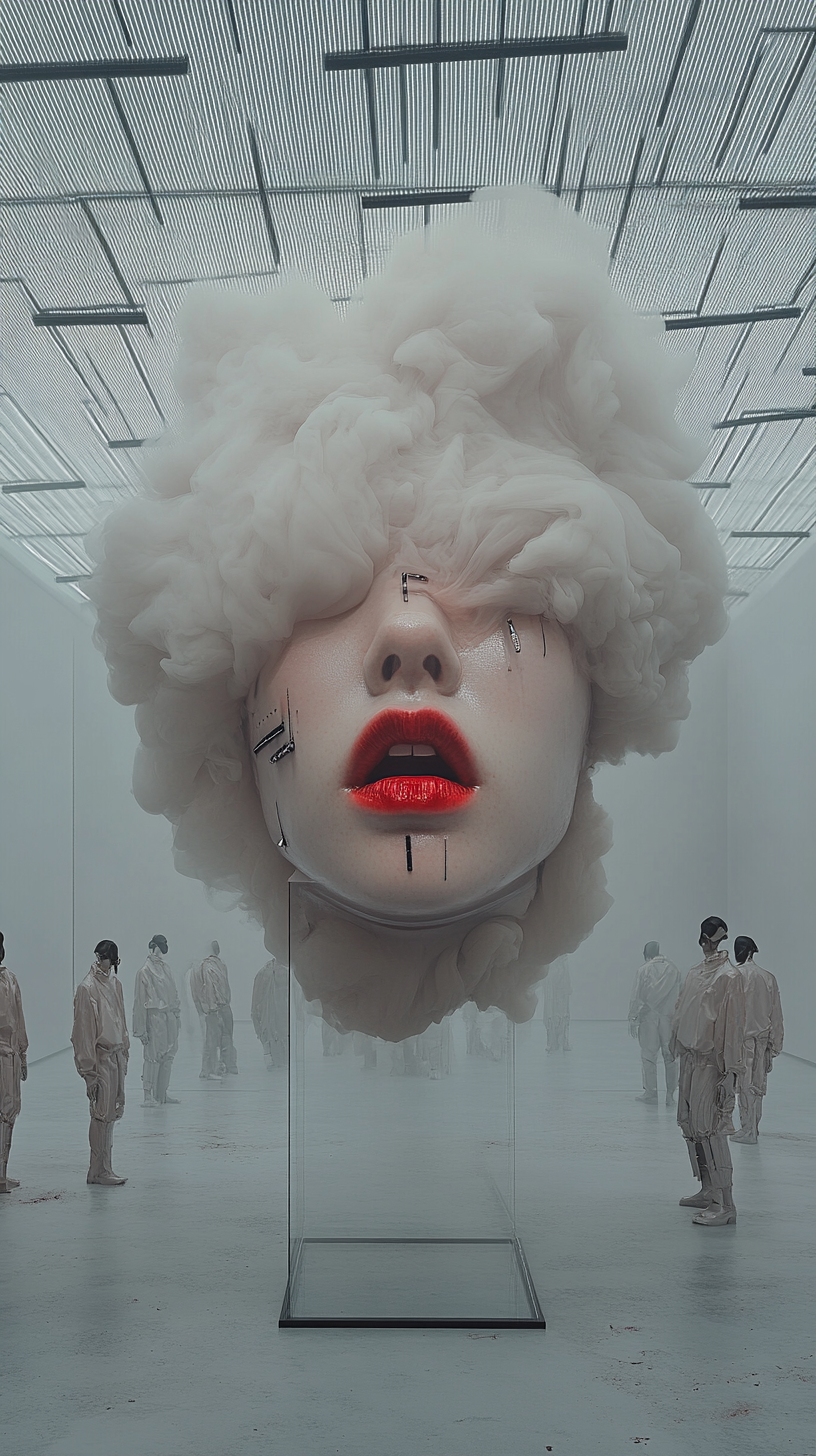 At the center stands a levitating female head, adorned with dramatic makeup and sculptural hair an architectural fusion of fashion and futurism. There is no body. Only a face: a symbol of our obsession with beauty, identity, and representation.